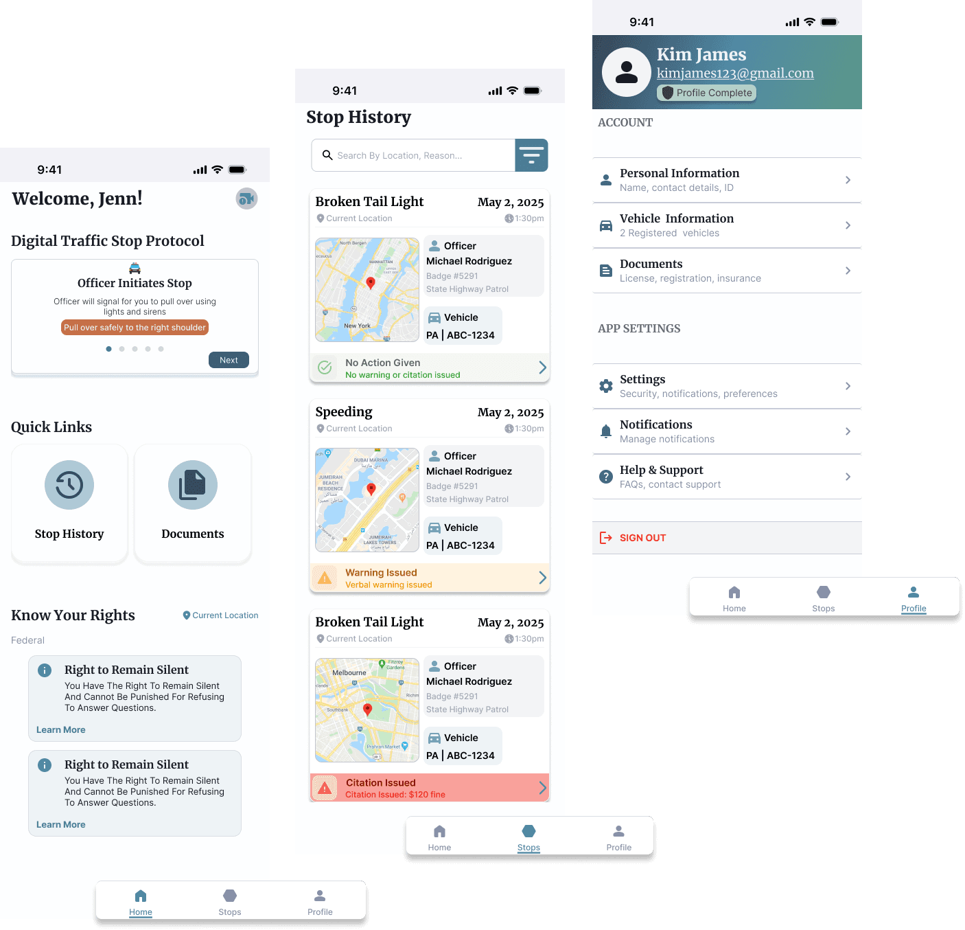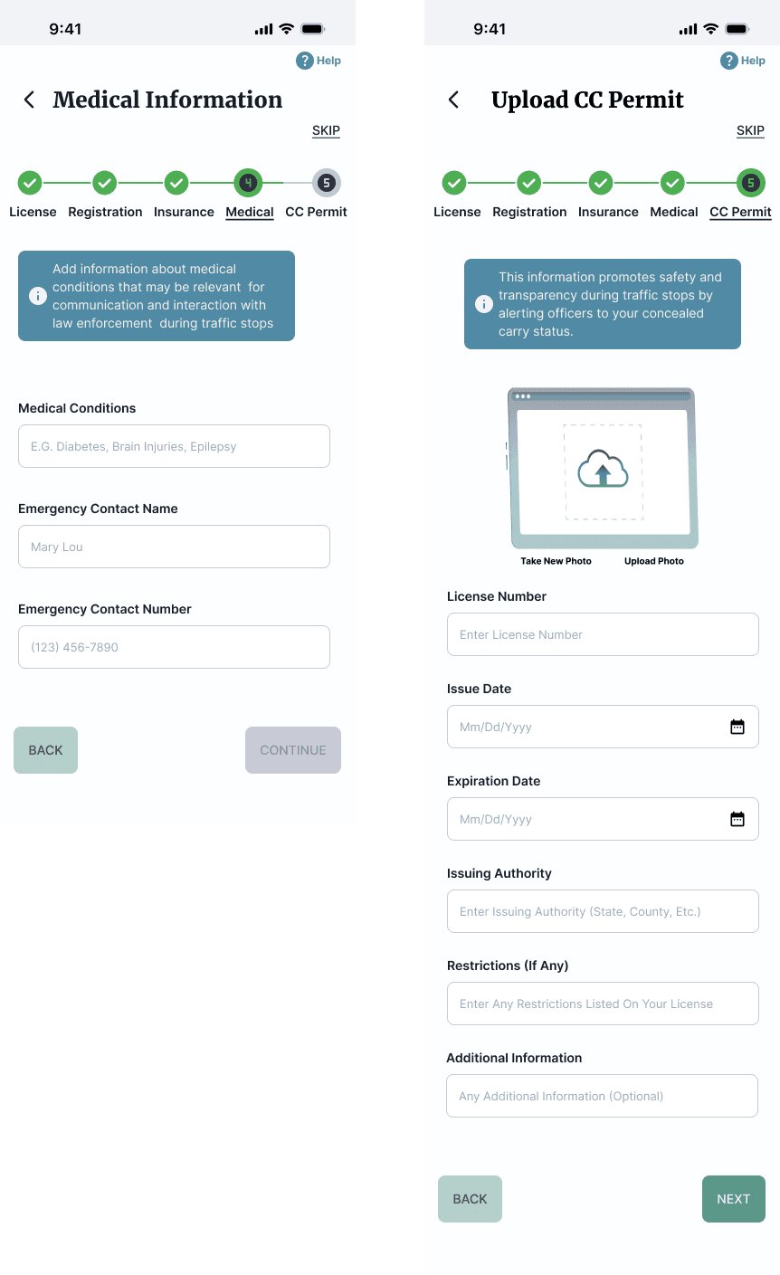 Optional health and conceal carry data: Motorists can share info (neurodivergence, medical conditions, CC Permit) for safer interactions