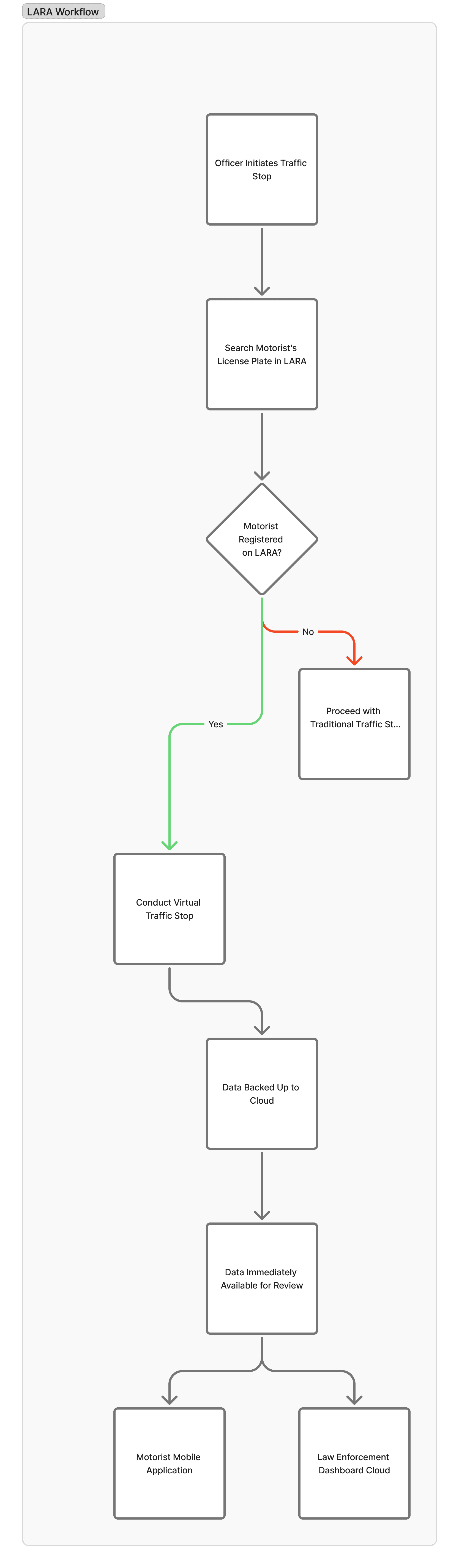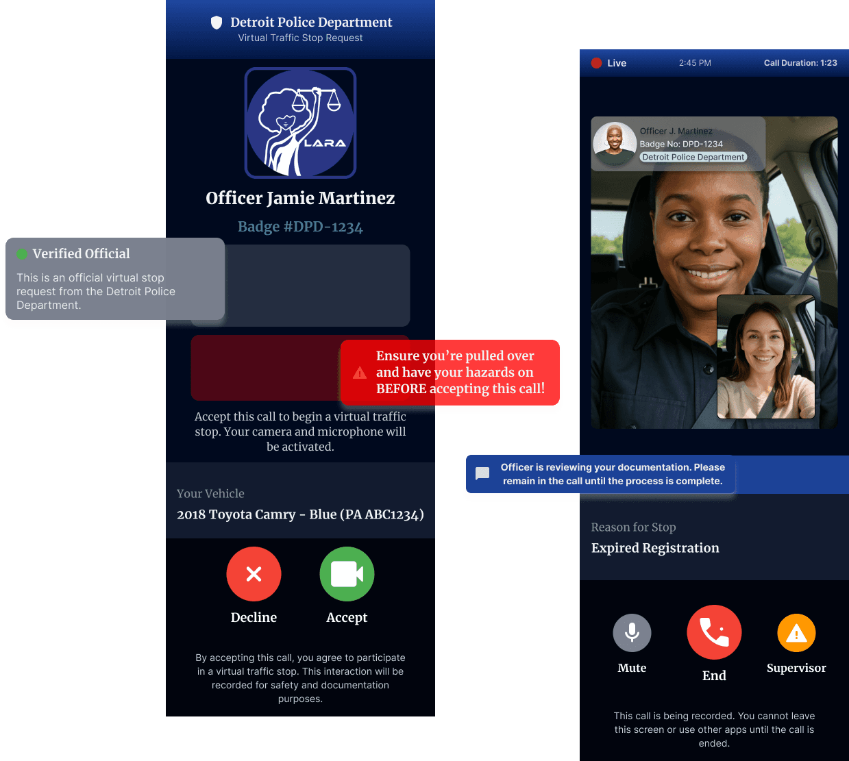 When an officer initiates a stop, they check if the motorist is registered. If yes, the entire interaction happens via video call—both parties stay in their vehicles while verifying credentials, explaining violations, and issuing citations.